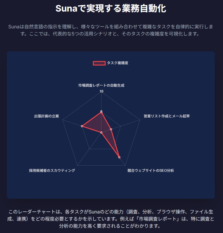 - Sunaの動作: 指定されたウェブサイトを分析し、SEOの観点から強みや弱み、対策すべきキーワードやコンテンツのアイデアをレポートします。専門的なデジタルマーケティングタスクの実行能力を示します。