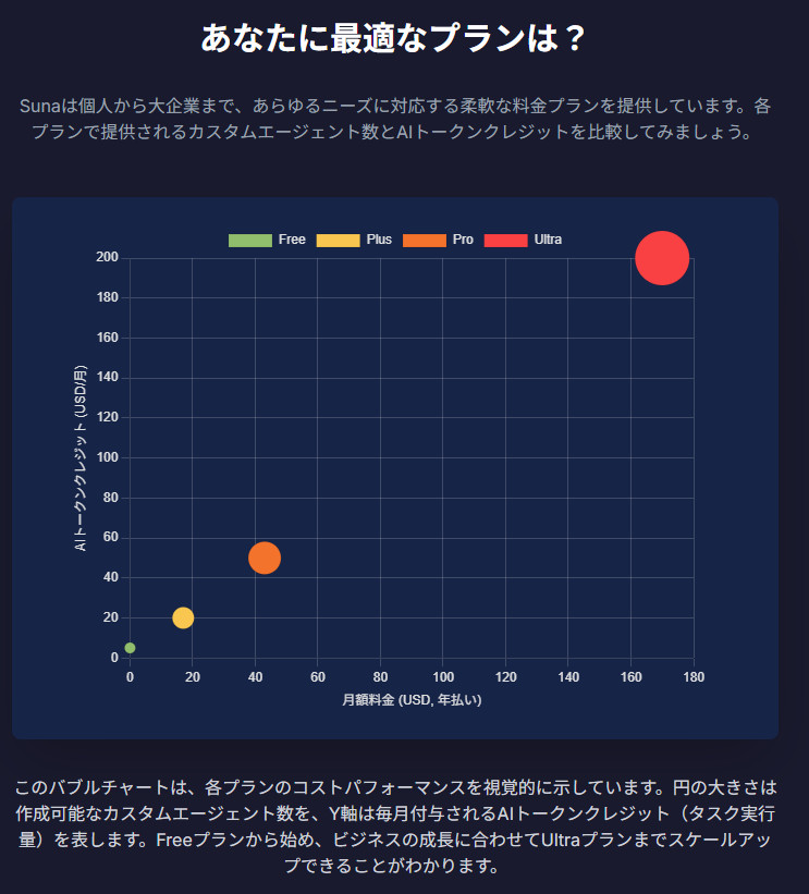 Kortix Sunaは、多くのユーザーが手軽に始められるフリーミアムモデルを採用しています 。無料で基本的な機能を試した後、必要に応じて有料プランにアップグレードすることが可能です。また、年払いにすることで月額料金が15%割引になります 。