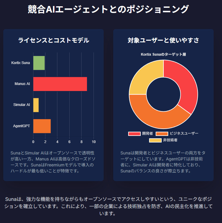 興味深いことに、「Suna」という名称は、競合するクローズドソースのAIエージェント「Manus」の綴りを逆にしたものです 。これは偶然ではなく、「Manusが約束する高度な機能を、無料で、オープンに、誰でも利用できるように提供する」という、市場に対する明確かつ挑戦的なメッセージと言えるでしょう。