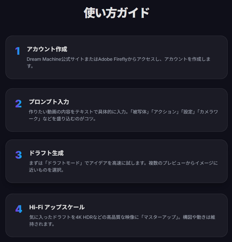 ここでは、公式プラットフォームであるDream Machineを使った基本的な動画生成の流れをステップバイステップで見ていきましょう。