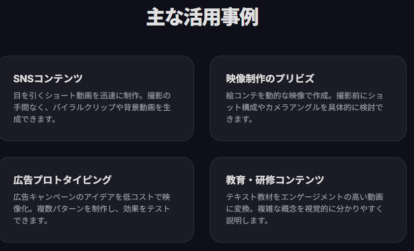 YouTube Shorts、Instagram Reels、TikTokといったショート動画プラットフォーム向けに、人々の目を引く映像コンテンツを迅速に制作できます 。ダイナミックなトランジション映像、商品の背景動画、短いバイラルクリップなどを、撮影の手間なく生成することが可能です 。