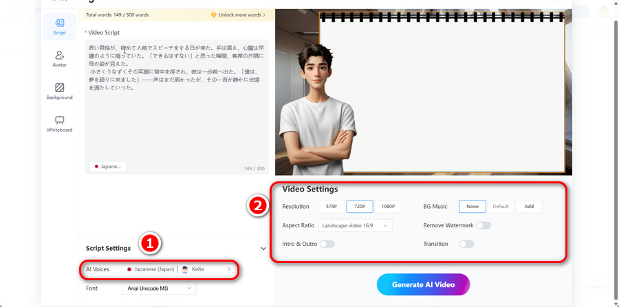 まず、言語のドロップダウンメニューから「Japanese」を選び、動画のプレゼンターとなるAIアバターの好みの声質(男性/女性など)を選択します 。次に、動画の出力の解像度、BGM、アスペクト比などを選択。