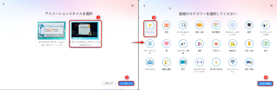 アニメーションスタイルを選択後、「次」をクリック、動画のカテゴリー選択でどれかを選択後「今すぐ作成」をクリックします。