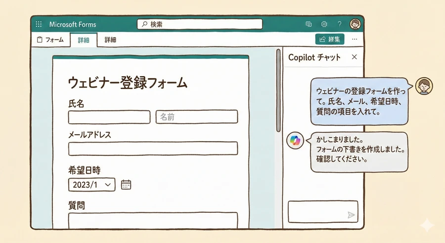 2026年の Microsoft Formsにおける最大の革新は、Copilotによる対話型のフォーム生成です。これにより、作成者は「ウェブセミナーの申し込みフォームを作成して」といった短い指示(プロンプト)を入力するだけで、タイトル、説明文、そして適切な設問項目をAIが自動的にドラフトとして提示します 。