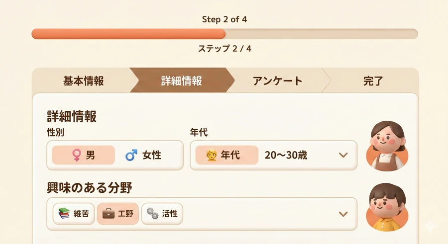 セクションでページを分割した際、設定から「進行状況バーを表示する」を有効にすると、回答者は現在全体のどの位置にいるのかを視覚的に把握できます 。これは長文のアンケートにおける完了率を向上させるための重要なテクニックです。また、セクションごとにタイトルやサブタイトルを設定できるため、回答者にページごとの趣旨を明確に伝えることが可能となります 。