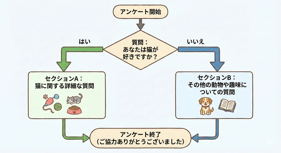 条件分岐は、回答者が選択した内容に基づいて、次に表示する質問やセクションを動的に変更する機能です。これにより、回答者にとって無関係な質問をスキップさせ、より関連性の高い項目のみを提示する「パーソナライズされた回答体験」を実現できます 。