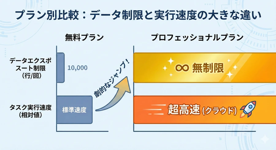 無料版は、スクレイピングの基本的な概念を理解し、小規模なプロジェクトをテストするための「評価の場」として設計されています 。