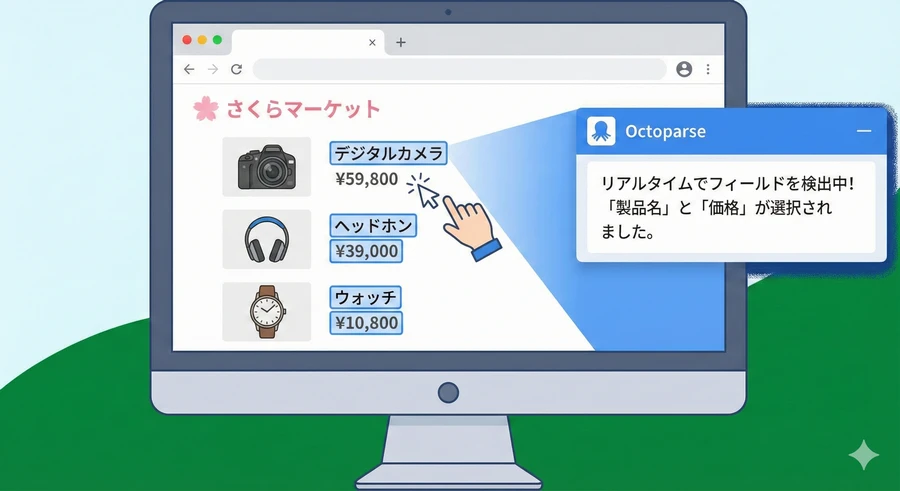 2. 自動識別の実行: 「Webページを自動識別する」をクリックすると、AIがページ内のタイトル、価格、画像URLなどの項目を検出し、データテーブルを作成します 。