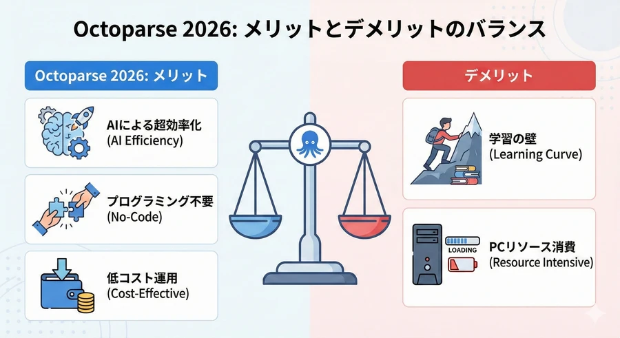 現代のビジネス環境において、ウェブ上に散在する膨大なデータをいかに効率よく収集し、意思決定に活用するかは、企業の競争力を左右する極めて重要な要素となっています。ウェブスクレイピングは、手動でのコピー&ペースト作業を自動化し、構造化されたデータセットを構築するための強力な手法ですが、かつては高度なプログラミング技術を必要としました。しかし、2026年現在のデータ抽出市場において、Octoparse(オクトパス)のようなノーコードツールの台頭により、非エンジニアであっても大規模なデータ収集が可能になっています 。本報告書では、2026年時点の最新の機能を踏まえ、Octoparseの導入から高度な活用方法、料金体系、そして利用者による客観的な評判までを詳細に分析し、解説します。