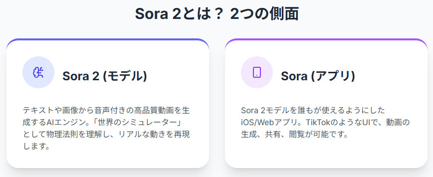Sora 2を理解する上でまず重要なのは、「Sora 2」というモデルと、「Sora」というアプリを区別することです。