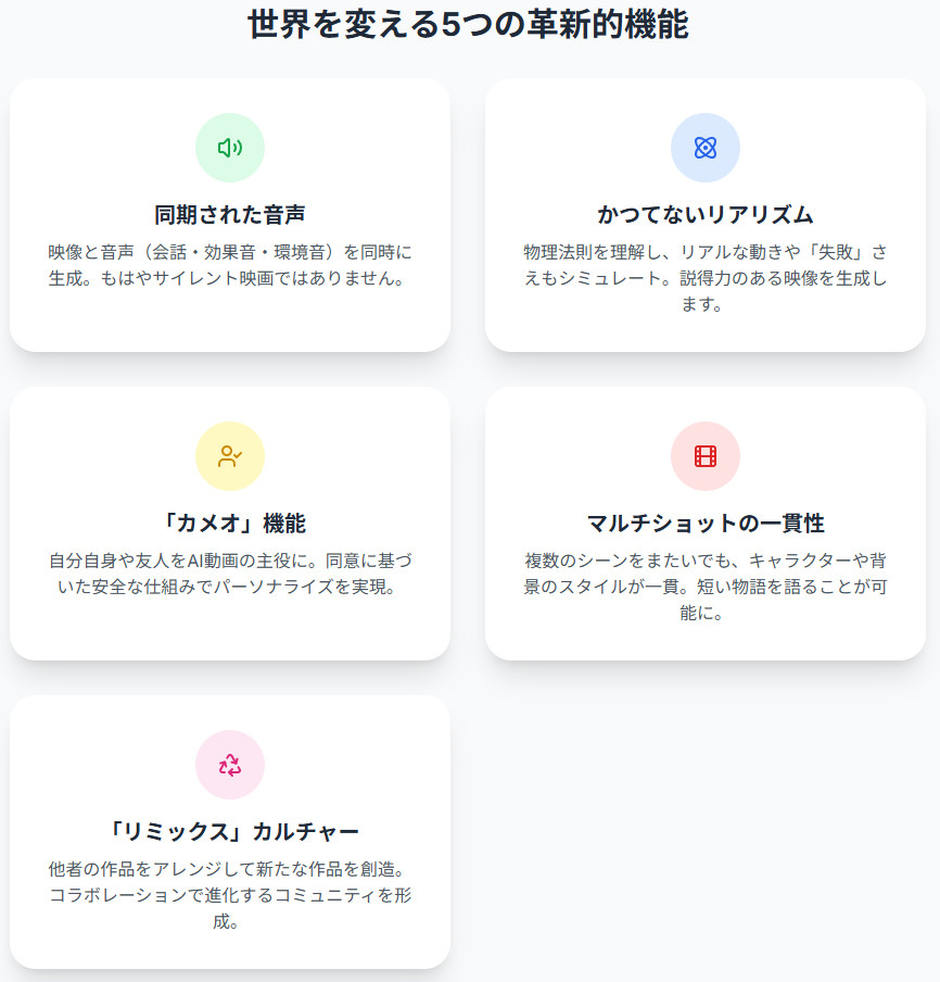Sora 2がなぜこれほどまでに注目を集めているのか、その核心はいくつかの画期的な機能にあります。ここでは、特に重要とされる5つの機能について、初心者にも分かりやすく解説します。