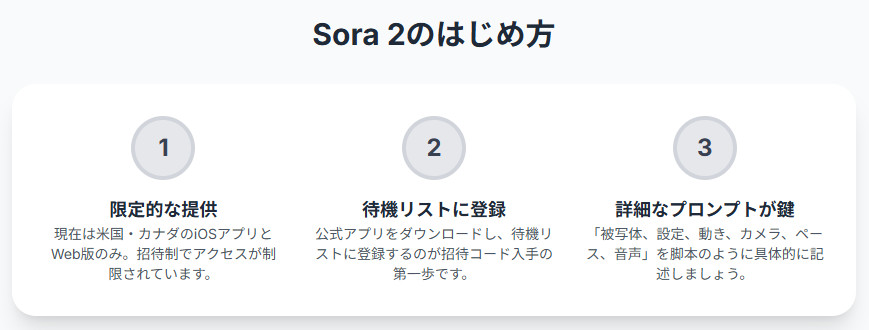 Sora 2を試してみたいと考えている方のために、現在の利用状況と具体的な始め方を解説します。ただし、現時点では利用にはいくつかの制約があるため、注意が必要です。