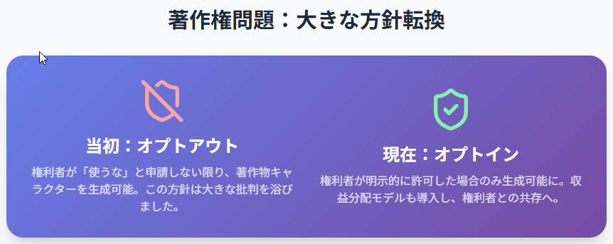 - 「オプトイン」への迅速な方針転換: この状況を受け、ローンチからわずか3日後、CEOのサム・アルトマン氏はブログ投稿で全面的に方針を転換すると発表。権利者が明示的に許可した場合にのみキャラクターを使用できる「オプトイン」方式へと移行しました 。