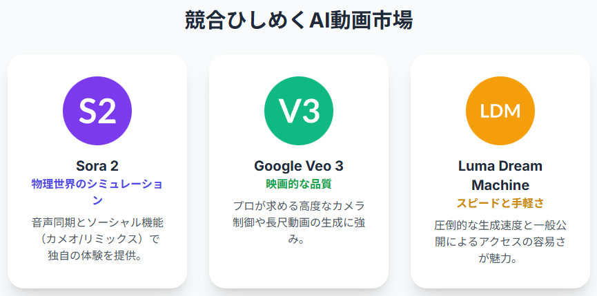 Sora 2は画期的なモデルですが、市場には強力な競合が存在します。特に、Googleの「Veo 3」とLuma Labsの「Dream Machine」は、Sora 2と比較される主要なライバルです。それぞれの強みを理解することで、Sora 2の独自性がより明確になります 。