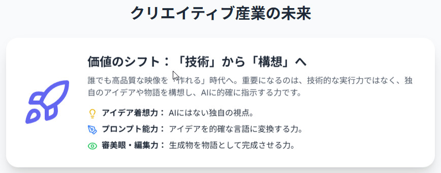 Sora 2がもたらす最も本質的な変化は、創造性における価値の所在を移行させることかもしれません。これまで映像制作の大きな障壁であった、機材の準備、ロケーションの確保、撮影といった「技術的な実行」のコストが劇的に低下します 。誰もが簡単に高品質な映像を「作れる」ようになった時、単に映像を作るという行為そのものの価値は相対的に低下します。