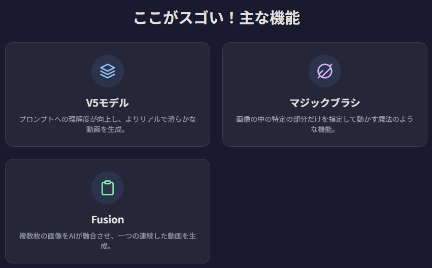 - Fusion(フュージョン): 最大3枚の異なる画像をアップロードし、それらをAIが知的に融合させて一つの連続した動画を生成する機能です。スタイルが全く異なる画像同士でも、AIが自然な構成で一貫性のある動画に仕上げるため、これまでにない独創的な映像表現が可能になります 。