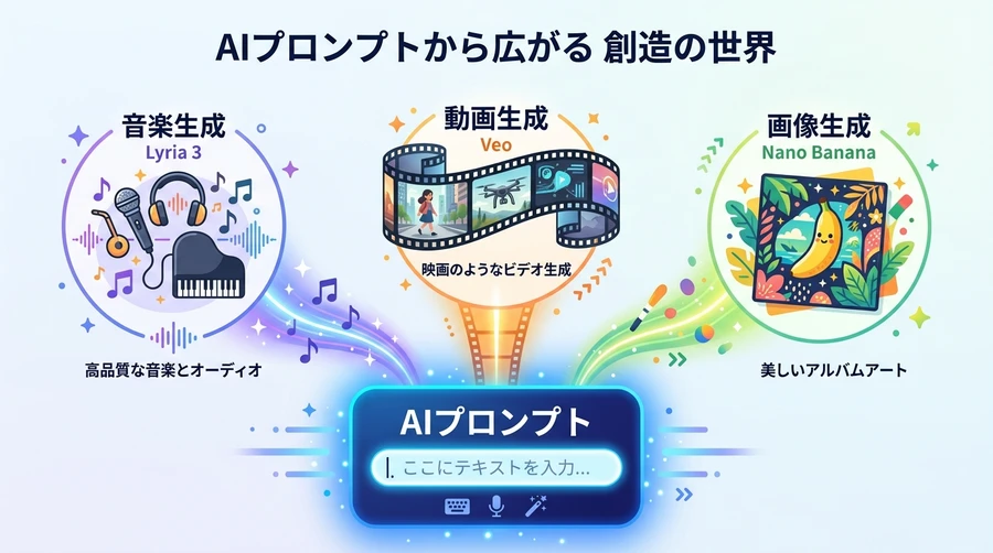 Google Labsへの統合により、ProducerAIはGoogleの強力なAIエコシステムの一部となりました。 これにより、テキスト生成の「Gemini」、動画生成の「Veo」、画像生成の「Nano Banana」といった各分野の最高峰AIが連携し、音楽を中心としたマルチモーダルな創作体験が提供されています。