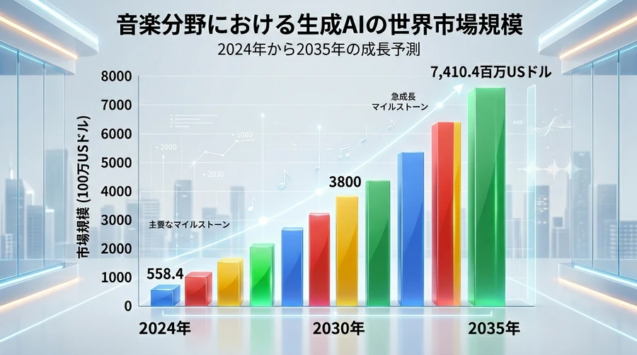 AI音楽制作の市場は、現在まさに「ハイパーグロース(超成長)」の段階にあります。 統計によれば、音楽における生成AI市場は、2025年から2035年にかけて爆発的な成長を遂げると予測されています。