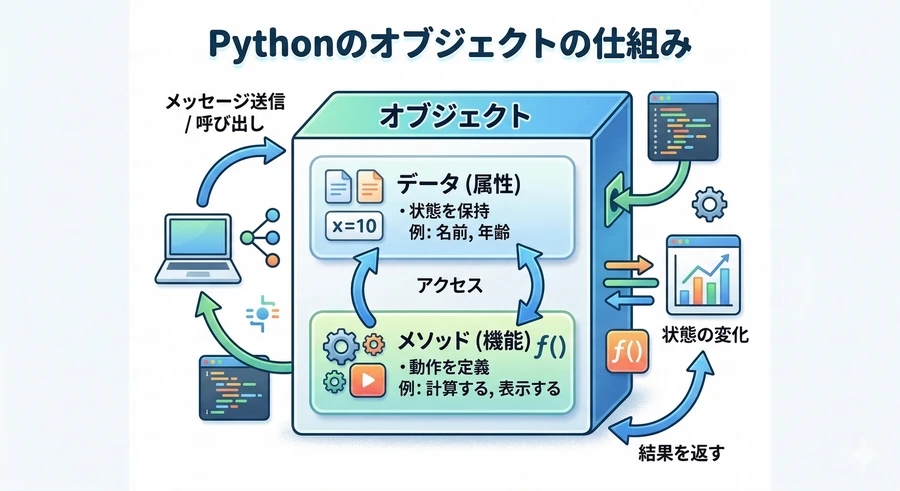 プログラミングの世界で「オブジェクト(Object)」という言葉を聞くと、何か難解なものを想像されるかもしれません。しかし、Pythonにおけるオブジェクトの考え方は、驚くほどシンプルで現実世界に近いものです。Pythonの世界では、数値、文字列、リスト、関数、さらにはプログラムそのものまで、あらゆるものが「オブジェクト」として存在しています [2]。
