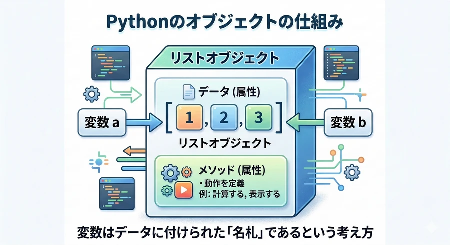 このコードを実行したとき、Pythonの中では「[1, 2, 3]というリストオブジェクト」が一つだけ作られ、そこに「a」と「b」という2つの名札が貼られた状態になります [11]。名札を剥がして別のオブジェクトに貼り替えることは自由ですが、名札自体がデータを持っているわけではありません。この仕組みを理解することは、後述するリストの操作やメモリ効率を考える上で非常に大きな助けとなります [12]。