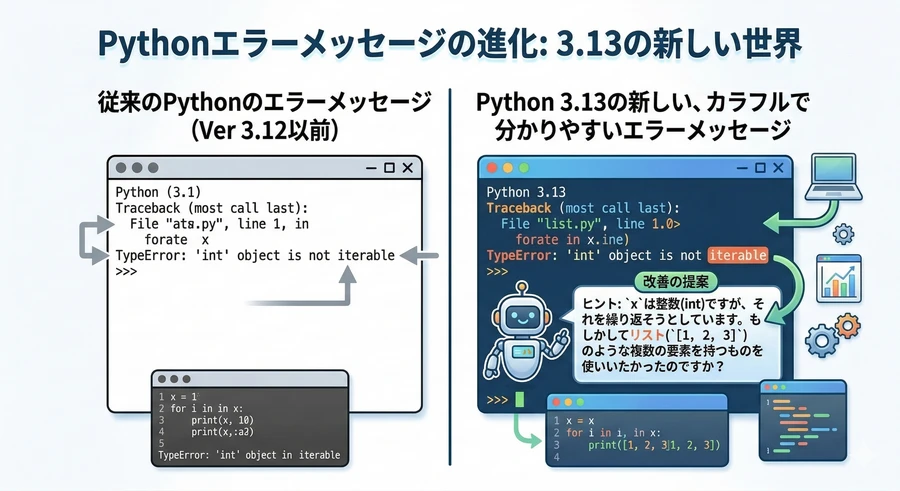 プログラミング初心者にとって、最新のPython 3.13を使用する最大のメリットは、単なる「速さ」だけでなく、「学びやすさ」と「親切さ」が劇的に向上している点にあります [46]。