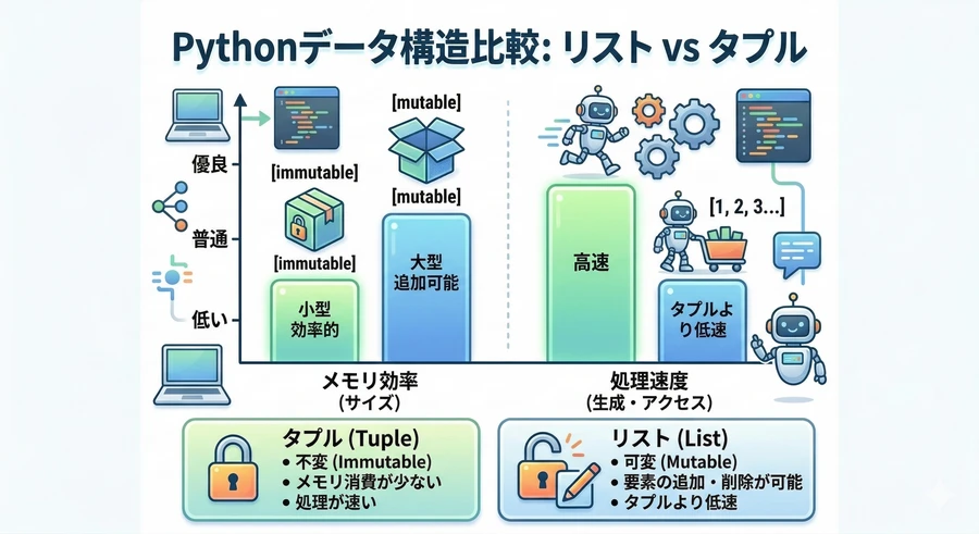 「一度決めたら変えたくないデータ」はタプルに、「状況に応じて中身が変わるデータ」はリストに、という使い分けを意識することで、より安全で意図の明確なプログラムを書くことができます [65]。