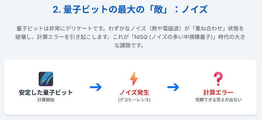量子ビットは、熱や電磁波といった周囲の環境からの僅かなノイズによって、その繊細な量子状態が簡単に壊れてしまう(デコヒーレンス)、という弱点を持っています 。計算中にエラーが発生すると、正しい結果を得ることができません。