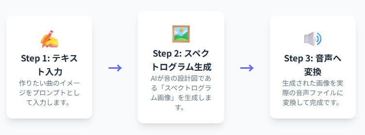 この仕組みを基に、Riffusionは以下のステップで音楽を生成します 。