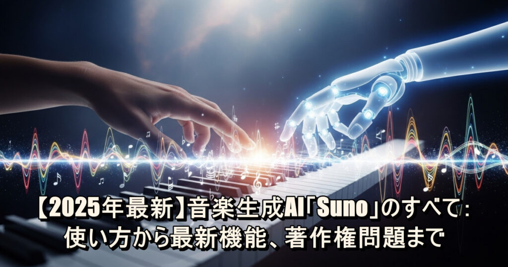 テキスト指示だけでボーカル付きのリアルな楽曲を自動生成する能力から、「音楽界のChatGPT」とも称され、プロの音楽家からAI初心者までを魅了しています。しかし、その輝かしい進化の裏で、生成された楽曲の権利、特に著作権を巡る法的な課題も浮上しています。本記事では、テクノロジーアナリストの視点から、Suno AIの基本情報、具体的な使い方、最新バージョンv4.5の進化、そして最も重要な著作権問題に至るまで、あらゆる側面を網羅的に、そして初心者にも分かりやすく徹底解説します。