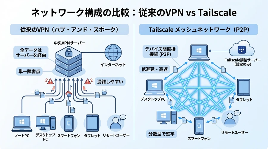 多くのVPNサービスは、中央のサーバーにすべての通信が集中する「ハブ・アンド・スポーク」型を採用しています。これに対し、Tailscaleは「メッシュネットワーク」を構築します。これは、デバイス同士が「1対1」で直接通信する仕組みです 。この方式には、通信速度が低下しにくい、特定のサーバーがダウンしてもネットワーク全体が止まらない、といった大きなメリットがあります