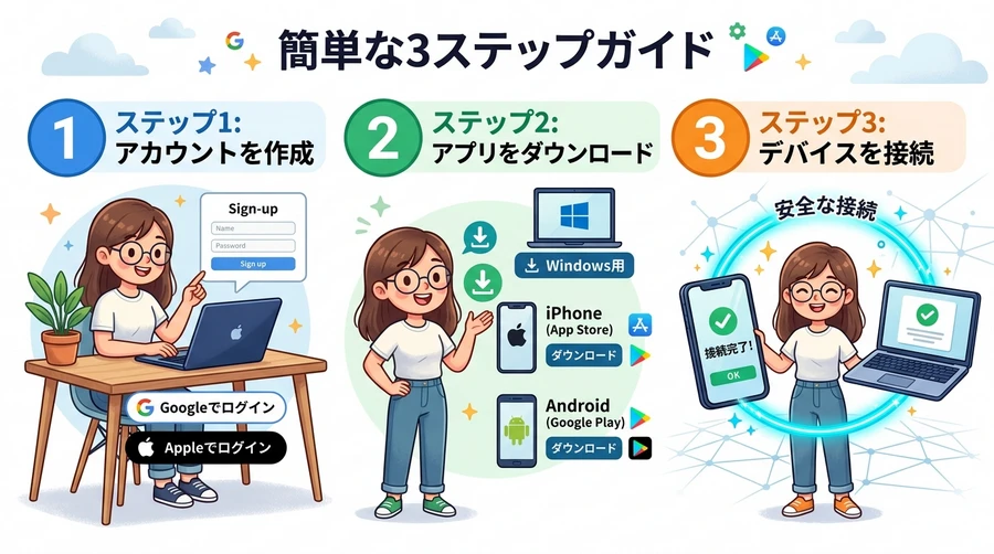 Tailscaleの導入は、一般的なアプリのインストールと同じくらい簡単です。専門的な「ネットワーク設定」は一切不要です。