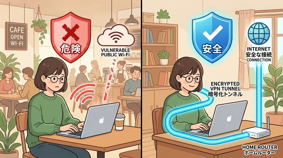 「Exit Node」は、外出先でのプライバシーを守る最強の機能です。カフェのフリーWi-Fiなど、安全性が不確かな環境にいるとき、自宅のパソコンを「出口」として指定することで、すべてのインターネット通信を自宅の回線経由で、かつ暗号化した状態で安全に行うことができます