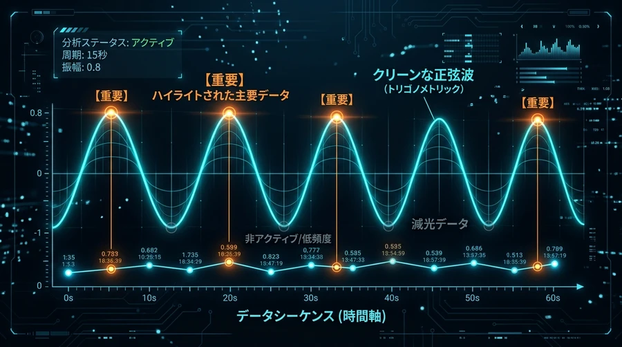 この「データの集中」を利用すれば、AIが次にどこに注目するかを、数学的な「波(三角関数)」を使って予測することができます 。 具体的には、以下のような「三角級数(Trigonometric Series)」の数式を用いて、各情報の重要度をスコアリングします