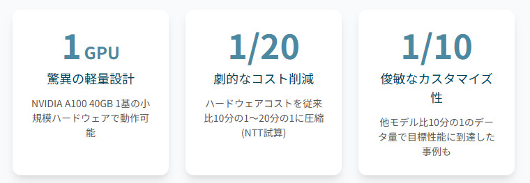 ある事例では、他モデルの10分の1の学習データ量で目標性能に到達できたと報告されており、これはAI導入にかかる時間とコストを大幅に削減できることを意味します 1。さらにNTTは、特にニーズの強い金融、医療、公共分野の専門知識をあらかじめ強化しており、これらの業界ではより迅速な導入と高い精度の実現が期待できます 3。