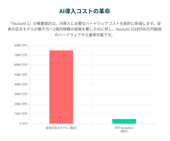 これは、AI導入における最大の障壁であったコスト問題を根本から覆すものです。数千万円から1億円以上ものハードウェア投資が必要だった従来の巨大モデルに対し、「tsuzumi 2」は約500万円程度のハードウェアで運用可能であり、コストを10分の1から20分の1にまで劇的に削減します 1。