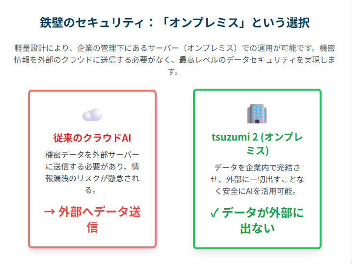 現代のビジネスにおいて、データは最も重要な資産の一つです。特に金融、医療、公共分野では、機密情報や個人情報を外部のサーバーに預けることへの懸念が根強くあります。「tsuzumi 2」は、この課題に対する明確な答えを提示します。