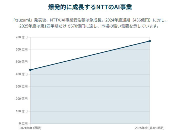 「tsuzumi 2」の登場は、すでに成功を収めているNTTのAI事業をさらに加速させるものです。初代「tsuzumi」が2023年11月に発表されて以降、NTTのAI事業は爆発的な成長を遂げています。2024年度通期の受注額が436億円だったのに対し、翌年度はわずか第1四半期だけで670億円に達し、企業からの相談件数は1,800件を超えました 1。