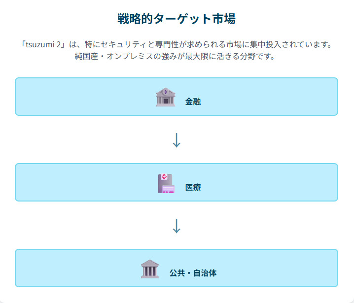 NTTは、「tsuzumi 2」の展開において、明確なターゲット市場を設定しています。それは、金融、医療、そして地方自治体などの公共分野です 1。