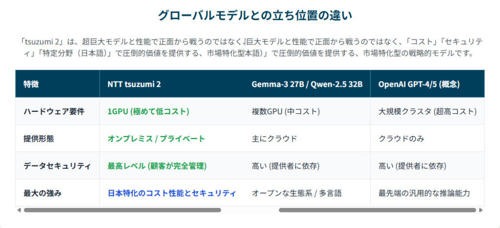 「tsuzumi 2」の真の実力を評価するためには、世界の競合モデルと比較し、その独自の立ち位置を理解することが不可欠です。結論から言えば、「tsuzumi 2」はOpenAIのGPTシリーズのような汎用AIの王者を直接打ち負かすことを目指しているのではありません。全く異なる土俵で、独自の価値を提供することに特化した、戦略的なモデルです。